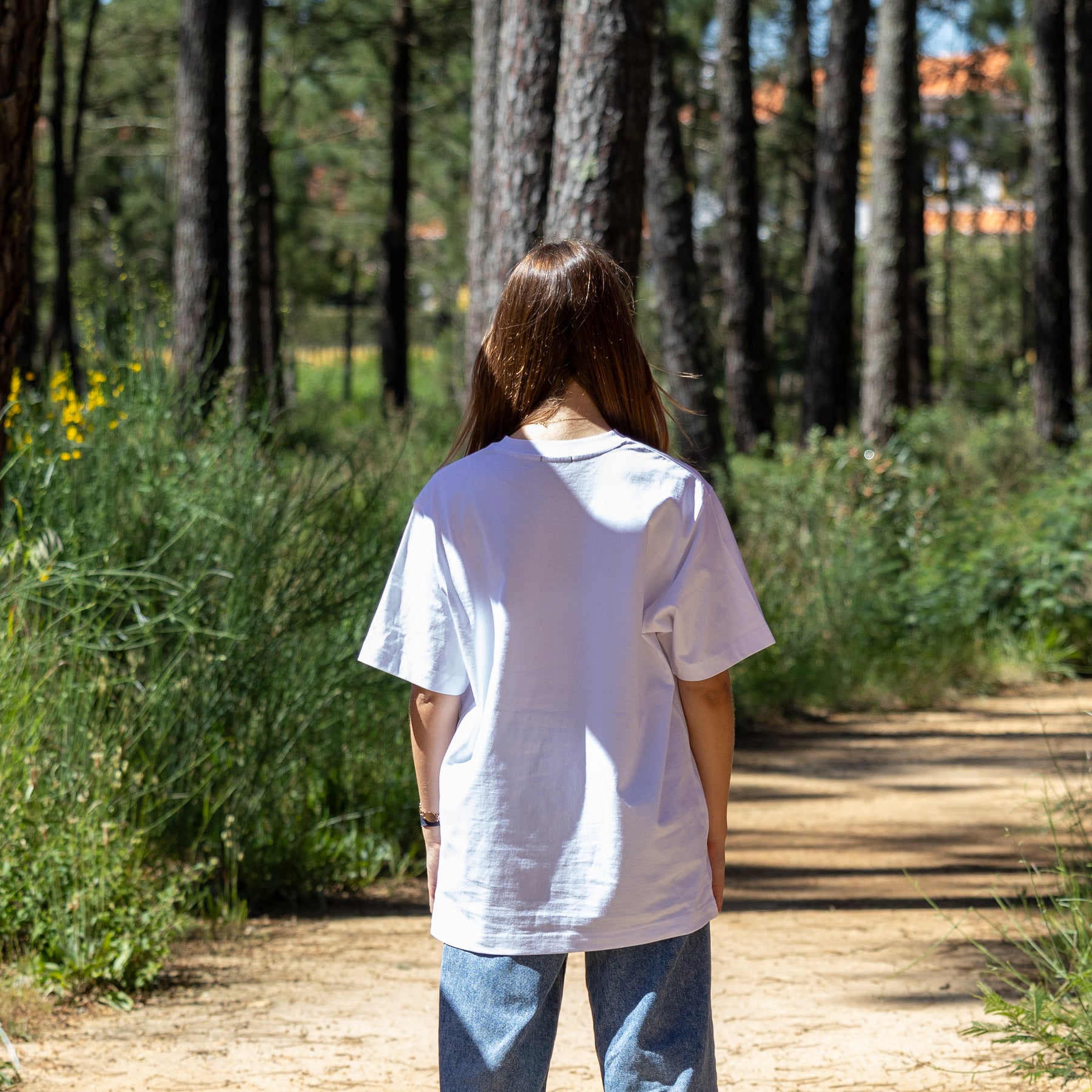 Hvid T-shirt med logo på kvindelig model set bagfra – loose fit og 100% økologisk bomuld
